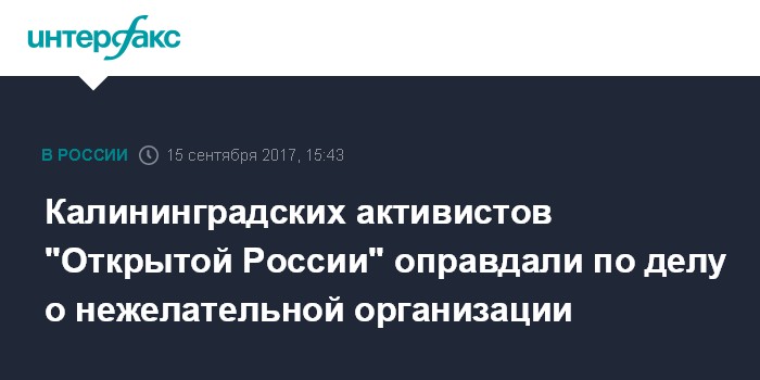 Москва. 15 сентября. INTERFAX.RU - Членов движения "Открытая Россия" оправдали в Калининграде по делу о нежелательной организации.