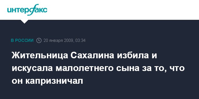 Южно-Сахалинск. 20 января. ИНТЕРФАКС-ДАЛЬНИЙ ВОСТОК - Жительница Анивы приговорена к восьми месяцам исправительных работ с удержанием 10% заработка в доход государства за жестокое отношение к своему четырехлетнему сыну.
