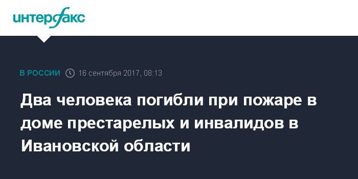 Москва. 16 сентября. INTERFAX.RU - Два человека погибли во время пожара в доме престарелых и инвалидов в городе Пучеж Ивановской области, сообщили "Интерфаксу" в Главном управлении МЧС по региону.