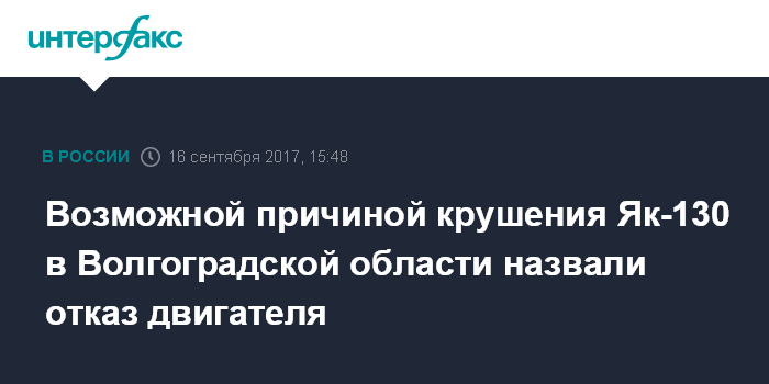 Москва. 16 сентября. INTERFAX.RU - Отказ систем двигателя мог стать причиной аварии военно-учебного самолета Як-130 вблизи аэродрома Борисоглебск в субботу, сообщил "Интерфаксу" осведомленный источник.