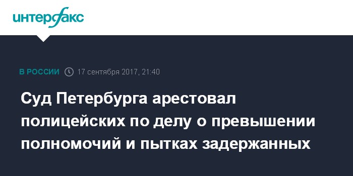 Москва. 17 сентября. INTERFAX.RU - Два бывших сотрудника полиции Санкт-Петербурга и трое действующих полицейских арестованы по делу о превышении полномочий и избиении задержанных, сообщили "Интерфаксу" в объединенной пресс-службе судов Петербурга в воскресенье.