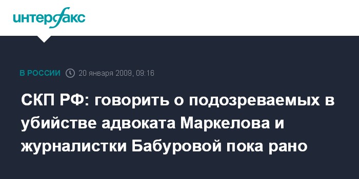Москва. 20 января. INTERFAX.RU - Задержанных по делу об убийстве адвоката Станислава Маркелова пока нет, заявили "Интерфаксу" в Следственном комитете при прокуратуре РФ (СКП РФ).