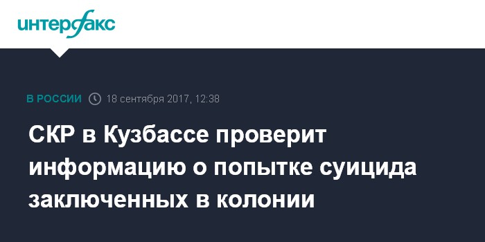 Москва. 18 сентября. INTERFAX.RU - Следственные органы СКР по Кемеровской области проводят доследственную проверку по факту попытки суицида нескольких заключенных в колонии строгого режима №37 в поселке городского типа Яя. Об этом сообщили агентству "Интерфакс" в пресс-службе СУ СКР по региону в понедельник.