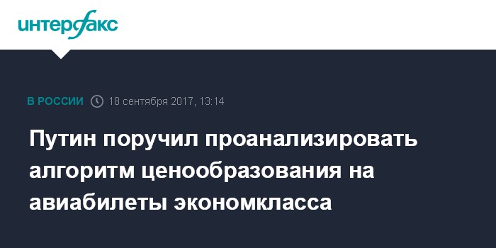 Так, правительству поручено проанализировать "алгоритм ценообразования с использованием компьютерных систем на авиабилеты в салонах экономического класса". Перечень поручений президента был подписан по итогам совещания, связанного с вопросами развития транспортной инфраструктуры Северо-Запада России.