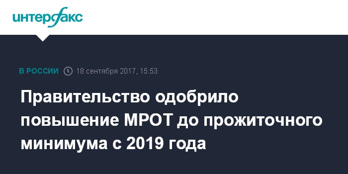 Москва. 18 сентября. INTERFAX.RU - Правительство одобрило законопроект о повышении МРОТ до прожиточного минимума с 1 января 2019 года, сообщил министр труда и социального развития Максим Топилин на брифинге по итогам заседания правительства.