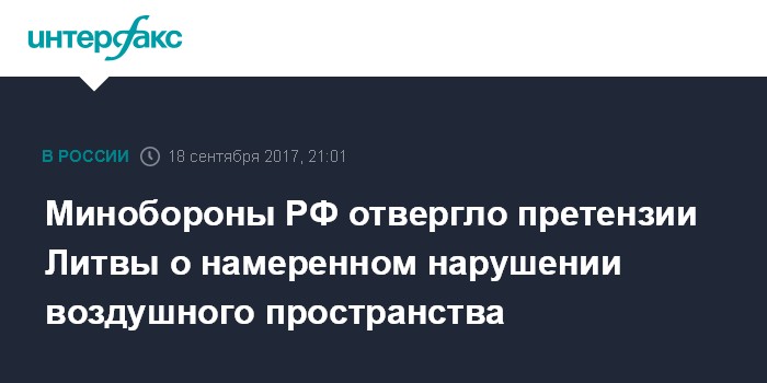 Москва. 18 сентября. INTERFAX.RU - Претензии Литвы о намеренном нарушении российскими самолетами воздушного пространства этой страны не соответствуют действительности, Вильнюс предупредили о вынужденном отклонении от маршрута из-за грозового фронта, заявили в понедельник в министерстве обороны России.