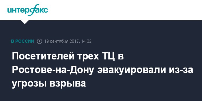 Москва. 19 сентября. INTERFAX.RU - Посетителей и персонал трех торговых центров Ростова-на-Дону эвакуируют из-за звонков о минировании, сообщил агентству "Интерфакс" информированный источник.