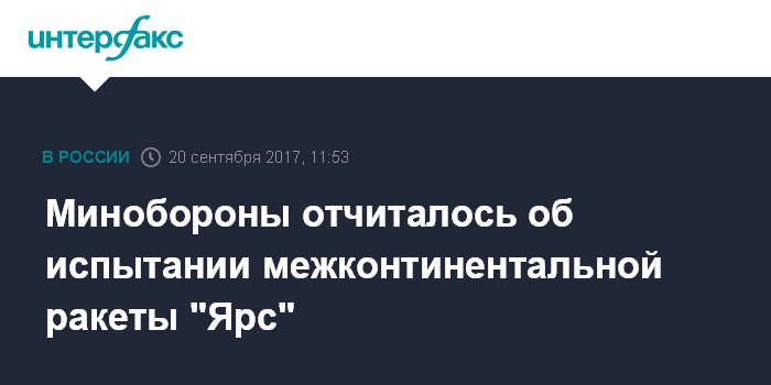 Москва. 20 сентября. INTERFAX.RU - Россия провела испытательный пуск твердотопливной межконтинентальной баллистической ракеты (МБР) РС-24 "Ярс" мобильного базирования с разделяющейся головной частью, сообщили в среду в Минобороны РФ.