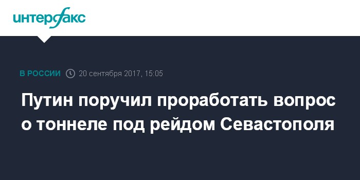 Москва. 20 сентября. INTERFAX.RU - Президент РФ Владимир Путин поручил проработать вопрос строительства тоннеля под севастопольским рейдом.