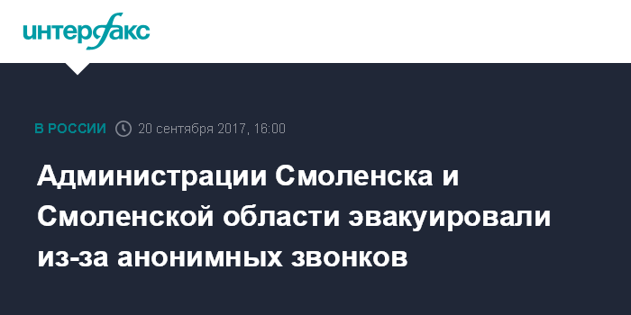 Москва. 20 сентября. INTERFAX.RU - Сотрудников и посетителей администраций Смоленска и Смоленской области эвакуировали в среду из-за сигналов о якобы заложенных взрывных устройствах, сообщили "Интерфаксу" в пресс-службе обладминистрации.