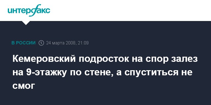 Кемерово. 24 марта. INTERFAX.RU - Спасателям города Кемерово пришлось снимать с 9-этажного жилого дома 14-летнего подростка, который, поспорив с друзьями, забрался на крышу здания подобно верхолазу, причем без всякой страховки.