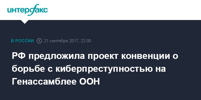 "Важно нацелить усилия ООН на выработку отвечающим интересам безопасности всех государств правил ответственного поведения в цифровой сфере. Россия подготовила проект универсальной конвенции о противодействии киберпреступности, включая хакерство, и предлагаем начать дискуссию в ходе уже нынешней сессии", - сказал российский министр, выступая с трибуны Генассамблеи ООН.