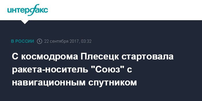 Москва. 22 сентября. INTERFAX.RU - Ракета-носитель "Союз-2.1б" со спутником системы глобального позиционирования ГЛОНАСС стартовала в пятницу с космодрома Плесецк, сообщили "Интерфаксу" в Департаменте информации и массовых коммуникаций Минобороны РФ.