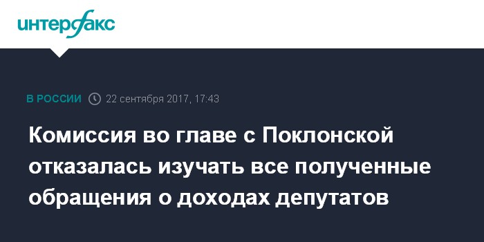 Москва. 22 сентября. INTERFAX.RU - На своем первом заседании комиссия Госдумы по контролю за достоверностью сведений о доходах, об имуществе и обязательствах имущественного характера депутатов не стала рассматривать поступившие обращения, в том числе от Transparency International, сообщила глава этой комиссии Наталья Поклонская.