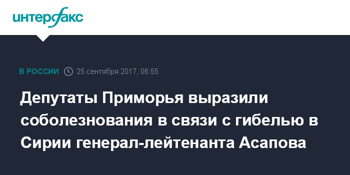 Москва. 25 сентября. INTERFAX.RU - Депутаты Законодательного собрания (ЗакС) Приморского края выразили соболезнования родным и близким генерал-лейтенанта Валерия Асапова, погибшего во время минометного обстрела в Сирии.