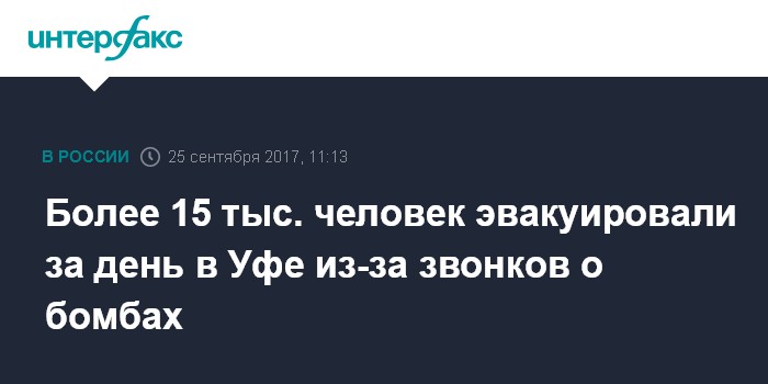 Москва. 25 сентября. INTERFAX.RU - Более 15,4 тысячи человек были эвакуированы в воскресенье из 20 объектов в Уфе из-за ложных сообщений о подозрительных бесхозных предметах и заложенных бомбах, сообщила в понедельник пресс-служба мэрии города.