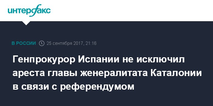 Москва. 25 сентября. INTERFAX.RU - Генеральный прокурор Испании Хосе Мануэль Маса не исключил развития событий, при котором глава исполнительной власти Каталонии Карлес Пучдемон, настаивающий на референдуме о независимости, может оказаться под стражей, передает в понедельник радиостанция Onda Cero.