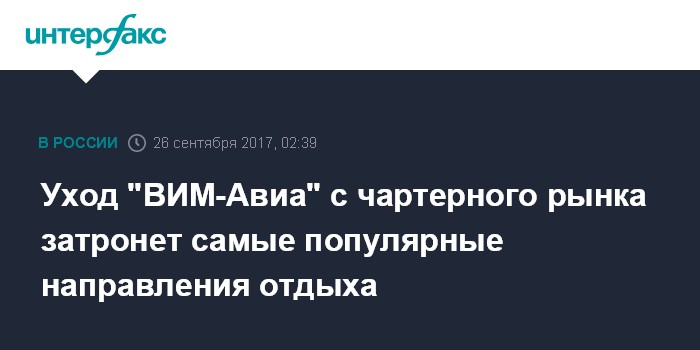 Москва. 26 сентября. INTERFAX.RU - Больше всего от ухода с рынка туристических перевозок авиакомпании "ВИМ-Авиа" пострадают наиболее массовые направления - Турция, Греция, Кипр, Крым и Сочи, сообщила порталу "Интерфакс-Туризм" в понедельник пресс-секретарь Российского союза туриндустрии (РСТ) Ирина Тюрина.