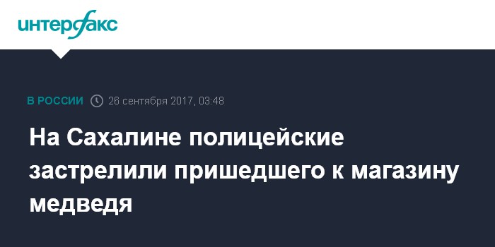 Москва. 26 сентября. INTERFAX.RU - Полицейские в городе Макаров Сахалинской области застрелили медведя, представлявшего опасность для людей, сообщает во вторник пресс-служба управления МВД России по региону.