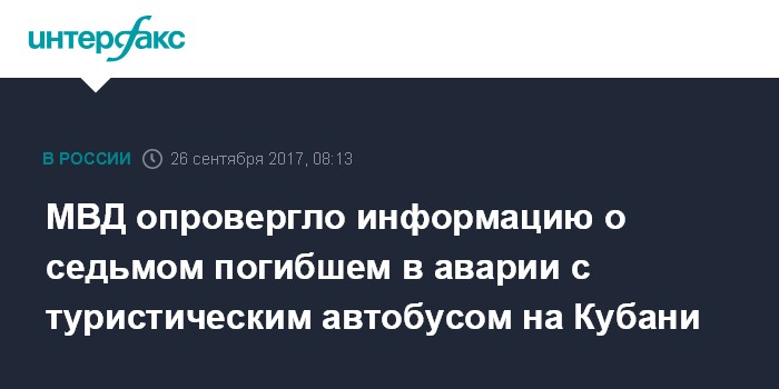 Москва. 26 сентября. INTERFAX.RU - Число жертв автокатастрофы с экскурсионным автобусом из Нижнего Новгорода в Краснодарском крае составляет 6 человек, информация о седьмом погибшем не подтверждается, сообщила агентству "Интерфакс" официальный представитель Главного управления МВД России по региону Мария Пирогова.