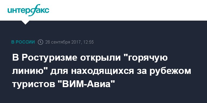 Москва. 26 сентября. INTERFAX.RU - "Горячая линия" открыта для находящихся за рубежом клиентов авиакомпании "ВИМ-Авиа". Об этом сообщает пресс-служба Ростуризма во вторник.