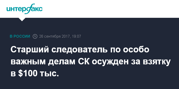 Старший следователь по особо важным делам СК осужден за взятку в $100 тыс.