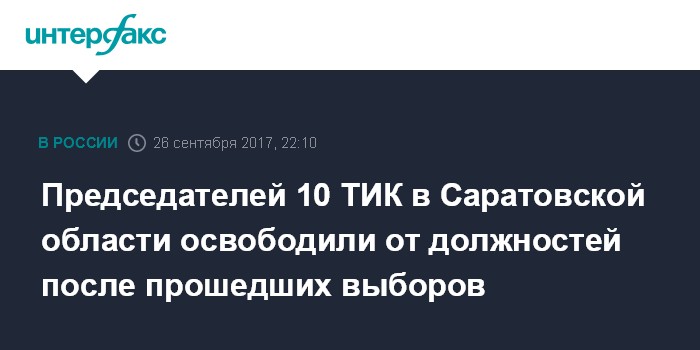 Москва. 26 сентября. INTERFAX.RU - Избирательная комиссия Саратовской области на заседании во вторник досрочно освободила от должностей председателей десяти территориальных избирательных комиссий (ТИК), говорится в тексте постановления на сайте облизбиркома.