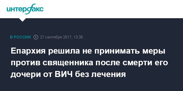 Москва. 27 сентября. INTERFAX.RU - Петербургская епархия пока не будет предпринимать каких-либо действий по отношению к священнослужителю - приемному отцу скончавшейся без лечения ВИЧ-инфицированной девочки.