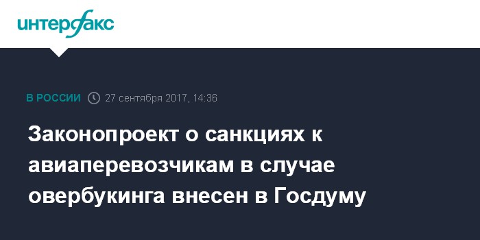 Москва. 27 сентября. INTERFAX.RU - Законопроект, вводящий санкции к перевозчикам в случае расторжения ими договора на воздушную перевозку пассажира в связи с продажей ему билета с превышением установленной пассажировместимости (овербукинг) внесен в Госдуму РФ депутатом Сергеем Мироновым и рядом депутатов от "Справедливой России".