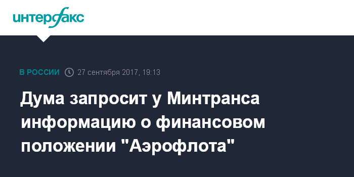 Москва. 27 сентября. INTERFAX.RU - Госдума намерена запросить у Минтранса и Росавиации информацию о финансовом положении российских авиакомпаний, в том числе "Аэрофлота", чтобы проверить, нет ли у них каких-либо проблем, заявил председатель думского комитета по транспорту и строительству Евгений Москвичев.