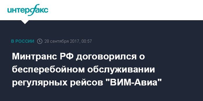 Минтранс РФ договорился о бесперебойном обслуживании регулярных рейсов "ВИМ-Авиа"