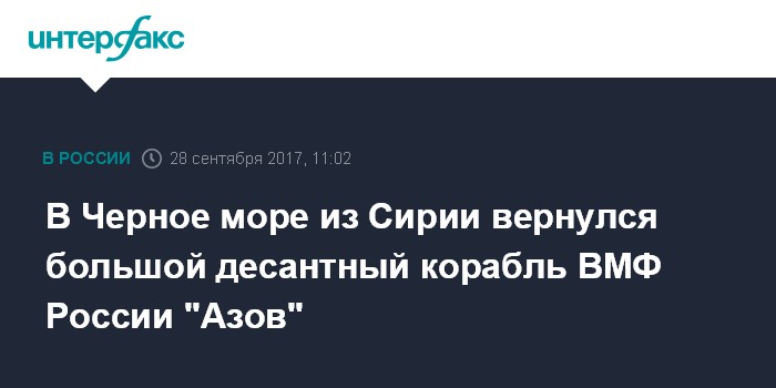 Москва. 28 сентября. INTERFAX.RU - Большой десантный корабль (БДК) Черноморского флота "Азов", возвращающийся из похода в Сирию, в четверг вошел в акваторию Черного моря. Об этом сообщили местные информационные порталы, публикующие фотографии его прохождения через Босфор.