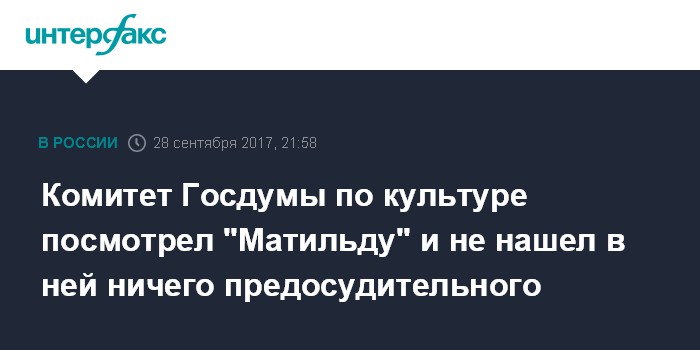 Москва. 28 сентября. INTERFAX.RU - Члены комитета Госдумы по культуре, а также депутаты из других комитетов в узком кругу с участием режиссера Алексея Учителя в четверг вечером посмотрели его фильм "Матильда" и сошлись во мнении, что его следует воспринимать не как документальный, а как художественный, сообщила "Интерфаксу" замруководителя комитета по культуре Ольга Казакова ("Единая Россия").