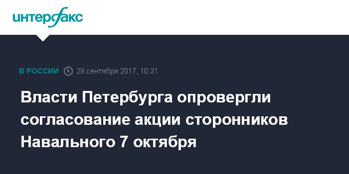 Накануне Навальный заявил, что власти Санкт-Петербурга фактически согласовали встречу на Марсовом поле 7 октября, не ответив на заявку отказом в установленный срок.