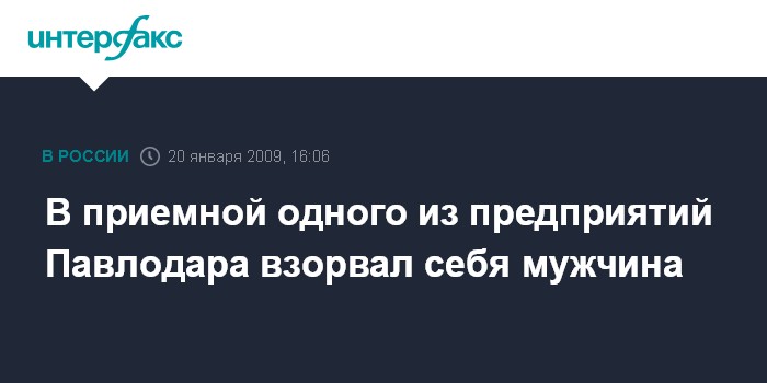 Павлодар. 20 января. INTERFAX.RU - В Павлодаре (адмцентр Павлодарской области Казахстана) в приемной одного из ТОО во второй половине дня во вторник 53-летний мужчина совершил самоубийство, приведя в действие самодельное взрывное устройство.