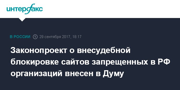 Москва. 29 сентября. INTERFAX.RU - Законопроект о внесении изменений в закон об информационных технологиях, подразумевающий внесудебное ограничение доступа к информационным ресурсам запрещенных в России организаций, внесен в Госдуму.