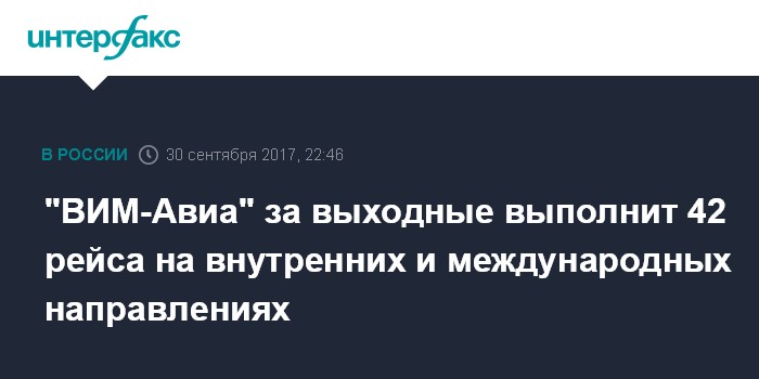 Москва. 30 сентября. INTERFAX.RU - Авиакомпания "ВИМ-Авиа", приостановившая выполнение чартерных полетов из-за финансовых проблем, выполнит за выходные 42 рейса на внутренних и международных направлениях, говорится в сообщении Минтранса РФ, опубликованном в субботу вечером по итогам заседания оперативного штаба под руководством замминистра транспорта Валерия Окулова.