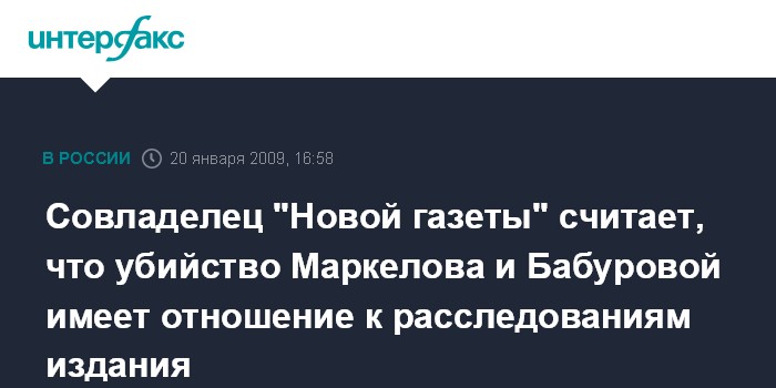 Москва. 20 января. INTERFAX.RU - Совладелец "Новой газеты" предприниматель Александр Лебедев уверен, что убийства адвоката Станислава Маркелова и журналистки Анастасии Бабуровой непосредственно связаны с журналистскими расследованиями этого издания.