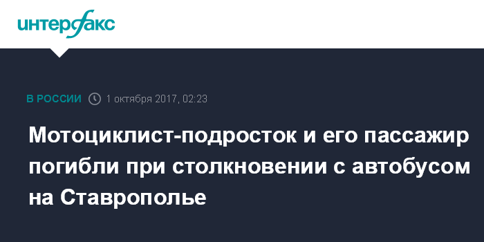Москва. 1 октября. INTERFAX.RU - Подросток, управлявший мотоциклом, в ночь на воскресенье спровоцировал столкновение с автобусом в Труновском районе Ставрополья, сообщили в краевом УГИБДД.