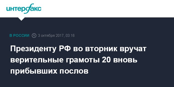 Президенту РФ во вторник вручат верительные грамоты 20 вновь прибывших послов