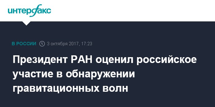 Москва. 3 октября. INTERFAX.RU - Лауреатом Нобелевской премии по физике 2017 года за детектирование гравитационных волн вместе с американцами Кипом Торном, Райнером Вайсом и Берри Беришем должен был стать российский физик, академик Владислав Пустовойт, заявил президент Российской академии наук (РАН) Александр Сергеев.