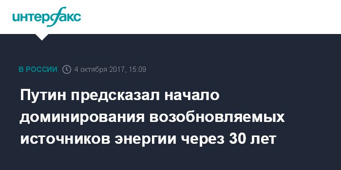Москва. 4 октября. INTERFAX.RU - Возобновляемые источники энергии (ВИЭ) смогут выйти на первое место в энергогенерации не раньше, чем через 30 лет, считает президент РФ Владимир Путин.