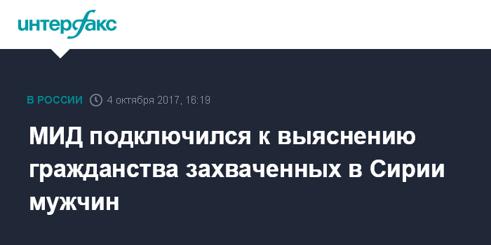 Москва. 4 октября. INTERFAX.RU - МИД РФ совместно с другими ведомствами ведет работу по установлению гражданства двух мужчин, захваченных боевиками в плен в Сирии. Об этом заявила в среду официальный представитель МИД России Мария Захарова.