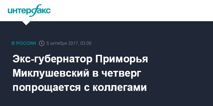 Москва. 5 октября. INTERFAX.RU - Бывший губернатор Приморья Владимир Миклушевский планирует в четверг провести встречу с аппаратом администрации региона и попрощаться с коллективом, сообщил агентству "Интерфакс" представитель администрации края.