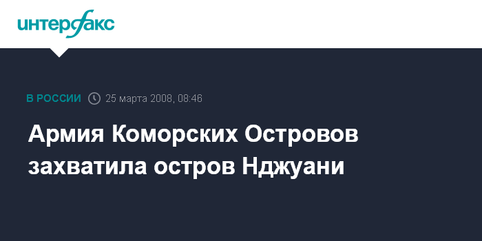 Лондон. 25 марта. INTERFAX.RU - Армия Союза Коморских Островов при поддержке подразделений сил Африканского Союза во вторник высадилась на острове Нджуани, чтобы положить конец правлению там объявившего себя президентом полковника Мохамеда Бакара, передает телерадиокомпания Би-Би-Си.