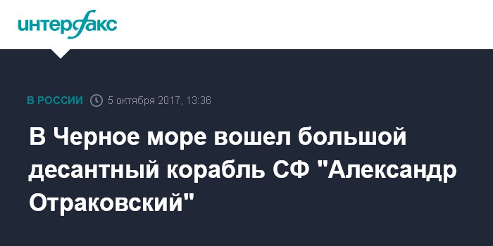 Москва. 5 октября. INTERFAX.RU - Большой десантный корабль ВМФ России "Александр Отраковский", совершающий переход с Северного флота, в четверг вошел в акваторию Черного моря. Об этом сообщили местные информационные порталы, публикующие фотографии его прохождения через Босфор.
