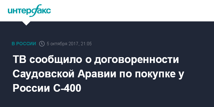 Москва. 5 октября. INTERFAX.RU - Саудовская Аравия и Россия в ходе визита саудовского короля Сальмана Бен Абдель Азиз Аль Сауда в Москву достигли договоренностей о поставках Эр-Рияду систем ПВО С-400, сообщает в четверг межарабский телеканал "Аль-Арабийя".