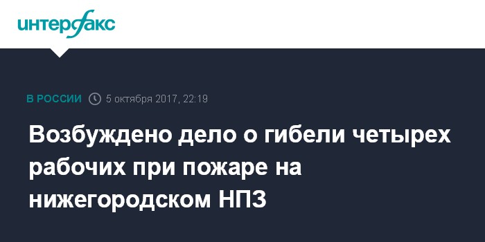 Москва. 5 октября. INTERFAX.RU - Следственные органы возбудили уголовное дело по факту пожара на территории "ЛУКОЙЛ-Нижегороднефтьоргсинтез", в результате которого в четверг погибли рабочие, сообщает управление СКР по Нижегородской области.