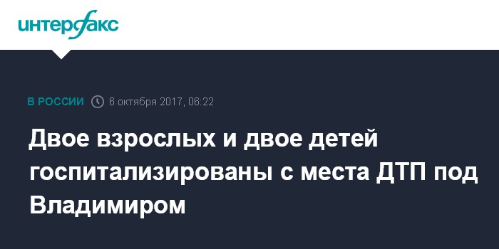 Москва. 6 октября. INTERFAX.RU - Четверо пострадавших, в том числе двое детей, доставлены с места автомобильной аварии во Владимирской области в Петушинскую районную больницу, еще одного пострадавшего везет скорая.