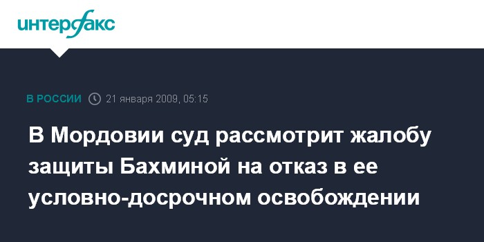 Москва. 21 января. ИНТЕРФАКС - Верховный суд Мордовии в среду рассмотрит кассационную жалобу защиты бывшего юриста НК "ЮКОС" Светланы Бахминой на отказ в ее условно-досрочном освобождении.